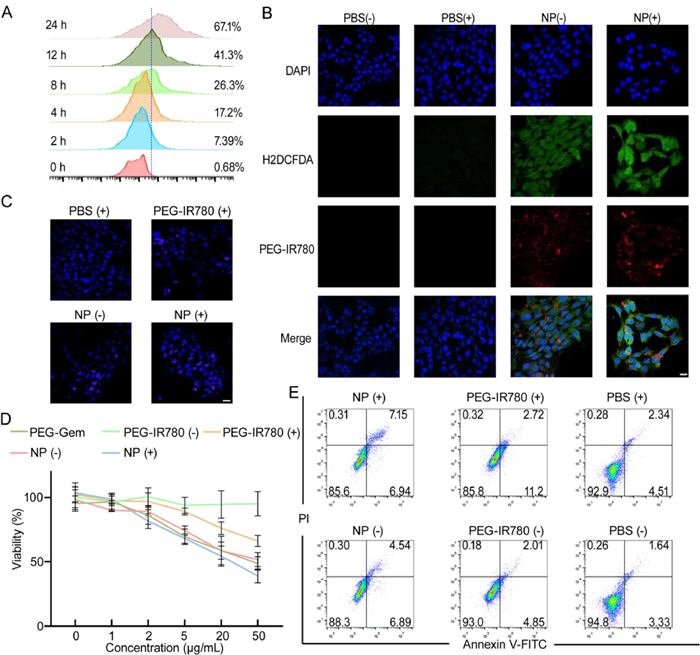 Mice breast cancer cell 4T1 was chosen for therapeutic experiments. Firstly, the red fluorescence from IR780 was exploited to evaluate the cellular uptake of NP. The change of fluorescence intensity at different time points (0, 2, 4, 8, 12, 24 h) showed the cellular uptake behavior increased over time and it was found that 24 h is enough for most NP being administrated (Fig. 2A). Intracellular ROS production was evaluated by the fluorescence probe H2DCFDA which reacted with singlet oxygen and generated a green fluorophore. Due to the self-fluorescence of PEG-IR780, the intracellular biodistribution of the NP could also been traced by red fluorescence (Fig. 2B). The obvious increase in green fluorescence under irradiation indicated the ROS generation. The co-location of green and red fluorescence also demonstrated the spatiotemporal consistency of the NP and produced ROS. To confirm the amplified DNA damage, antibody against γ-H2AX was used to detect DNA double strand breaks. Treated with NP and 660 nm laser, a stronger red fluorescence was generated and merged with the blue fluorescence from DAPI to produce a purple signal (Fig. 2C). Methyl thiazolyl tetrazolium (MTT) assay was conducted to evaluate the cytotoxicity of various treatments (Fig. 2D). Compared with laser irradiation or gemcitabine alone, NP combined with laser treatment got the best anti-cancer effects, which demonstrated the synergistic treatment can enhance PDT. Annexin V/PI apoptosis staining was performed to further confirm the enhanced PDT of NP (Fig. 2E). Combining NP and irradiation treatment, total apoptosis ratios obviously increased from 4.99% to 14.09% compare with control group.