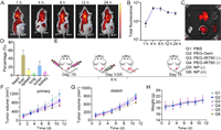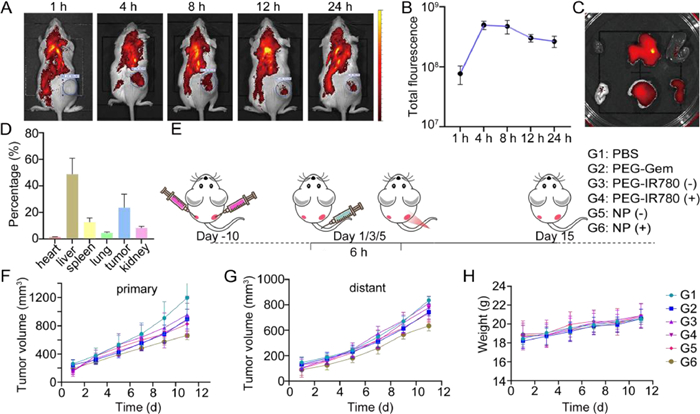 | Fig. 3. In vivo experiments. (A) In vivo fluorescent images at different time points. (B) Quantitative analysis of the total fluorescence in tumor areas (n = 3). (C) Ex vivo fluorescent images of major organs at 24 h post-injection. (D) Quantitative analysis of ex vivo fluorescence at 24 h post-injection. (E) Anti-tumor experiment procedure (dose of drug was quantified by polymer: 100 µg/mice). (F) Primary tumor volume. (G) Distant tumor volume. (H) Body weight of mice. G1: PBS, G2: PEG-Gem, G3: PEG-IR780 (−), G4: PEG-IR780 (+), G5: NP (−), G6: NP (+), where (+) represent the 660 nm laser treatment 6 h after injection. Data are presented as mean values ± SD (n = 4). | |