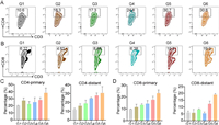 | Fig. 4. Immune evocation. Flow cytometric and quantitative analysis of CD4+ T cells (A) and CD8+ T cells (B) in distant tumors. Quantification data of CD4+ T cells (C) and CD8+ T cells (D) in primary and distant tumors. G1: PBS, G2: PEG-Gem, G3: PEG-IR780 (−), G4: PEG-IR780 (+), G5: NP (−), G6: NP (+), where (+) represent the 660 nm laser treatment 6 h after injection. Data were presented as mean values ± SD (n = 3). | |