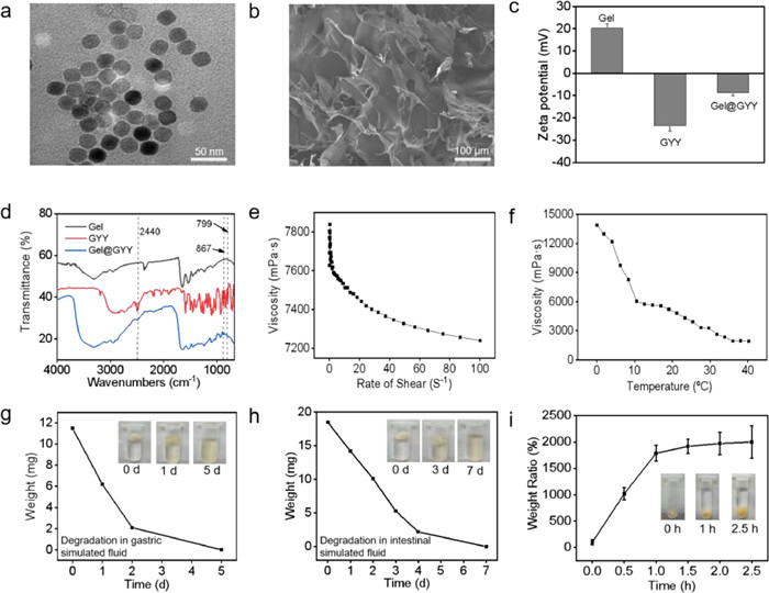 | Fig. 1. Characterizations of Gel and Gel@GYY. (a) TEM image of Gel NPs. (b) FE-SEM image of porous Gel. (c) Zeta potential of Gel, GYY and Gel@GYY. (d) Micro-FTIR spectra of Gel, GYY and Gel@GYY. (e) Viscosity change at various shear rates. (f) Viscosity change at various temperatures. (g) Degradation of freeze-dried Gel in gastric simulants. Inset: Photographs of the degradation process, illustrating that the Gel can gradually degrade in a gastric acid environment for 5 at least days. (h) Degradation of lyophilized Gel in an intestinal fluid simulant. Inset: Photographs of lyophilized Gel ointment degradation process, illustrating that the Gel can gradually degrade in intestinal simulant within 7 days. (i) Swelling property of the Gel. Inset: Direct observation of the swelling characteristic of the lyophilized Gel in PBS buffer. Data represent mean ± standard error of the mean (n = 3). | |