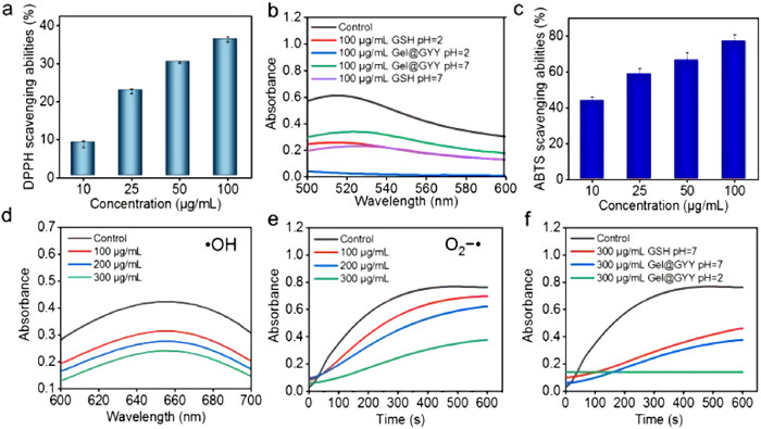 | Fig. 2. Free radicals scavenging ability in vitro. (a) DPPH scavenging ability of Gel@GYY at pH 7. (b) Comparison of DPPH scavenging ability of Gel@GYY with GSH at pH 2 or pH 7. (c) ABTS scavenging ability of Gel@GYY at pH 7. (d) •OH scavenging ability of Gel@GYY at pH 7. (e) O2−• scavenging ability of Gel@GYY at pH 7. (f) Comparison of O2−• scavenging ability of Gel@GYY with GSH at pH 2 or pH 7. Gel@GYY concentrations refer to the concentration of loaded GYY. Data represent mean ± standard error of the mean (n = 3). | |