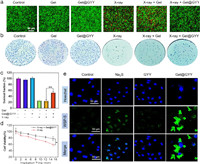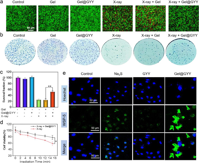 | Fig. 3. Protection effect and H2S release in IEC-6 cells. (a) Live-dead staining of IEC-6 cells with different treatments. X-ray power: 45 kV, 75 µA, 10 min. (b) Clonal survival experiments of IEC-6 cells in each group. X-ray irradiation dose: 6 Gy. (c) Responding survival fraction of IEC-6 cells in each group after 7-day colony (**P < 0.01). (d) Cell viability of X-ray group and X-ray + Gel@GYY group at different radiation time. X-ray power: 45 kV, 75 µA, 10 min (*P < 0.05). (e) Intracellular H2S release detected by fluorescent imaging of differently treated IEC-6 cells using WSP-5 probe. Data represent mean ± standard error of the mean (n = 3). | |