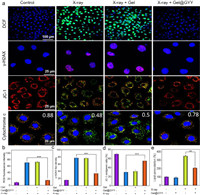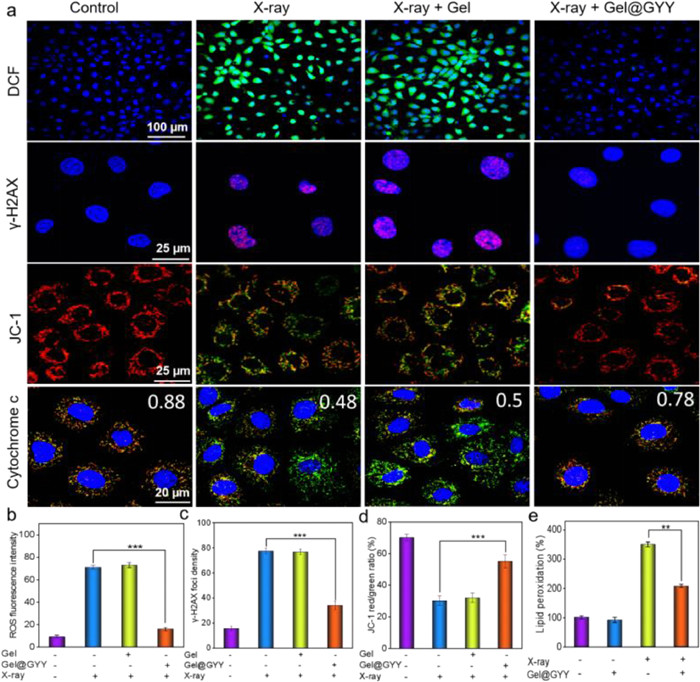 DNA is another major target for ROS to attack cells. Therefore, phospho-histone H2AX (γ-H2AX) closely related to DNA damage was used to determine double-stranded DNA breakage (DSBs). As shown in Figs. 4a and c, in the X-ray group, the proportion of red was significantly increased, indicating that there were significant DSBs in the IEC-6 nucleus. In contrast, DSBs of the X-ray + Gel@GYY group decreased dramatically compared to the X-ray group, which significantly suggested that Gel@GYY can effectively weaken radiation-induced DNA damage. The decrease of mitochondrial membrane potential (MMP) is a landmark event of cell apoptosis. We therefore used an MMP detection kit (JC-1) to measure whether the MMP of IEC-6 cells will change in each group. Green fluorescence produces when MMP is low but red fluorescence appears when MMP is high. In Figs. 4a and d, the fluorescence and red/green ratio indicated the change of MMP. The red/green ratio of the X-ray group was significantly lower than that of the control group, indicating a severe decrease of MMP. In contrast, red/green ratio of the X-ray + Gel@GYY group was close to that of the control group, indicating that Gel@GYY can protect mitochondria by well inhibiting the decrease of MMP. The decreased MMP can cause mitochondrial dysfunction, which releases cytochrome c for activating the apoptotic pathway. Therefore, we further studied the released cytochrome c by colocalization of cytochrome c and mitochondria (Fig. 4a). Red fluorescence and green fluorescence represent mitochondria and cytochrome c, respectively. These two fluorescence signals in the control group almost overlapped with a Pearson's correlation coefficient (PCs) of 0.88. In contrast, these two fluorescence signals in the X-ray group sharply separated and PCs decreased to 0.48, indicating the release of cytochrome c from the mitochondria. However, the green and red fluorescence signals of the X-ray + Gel@GYY group highly overlapped and the PCs reached 0.78, which was close to the value of control group, indicating the effective inhibition of the release of cytochrome c and thereby inhibition of cell apoptosis by the Gel@GYY.