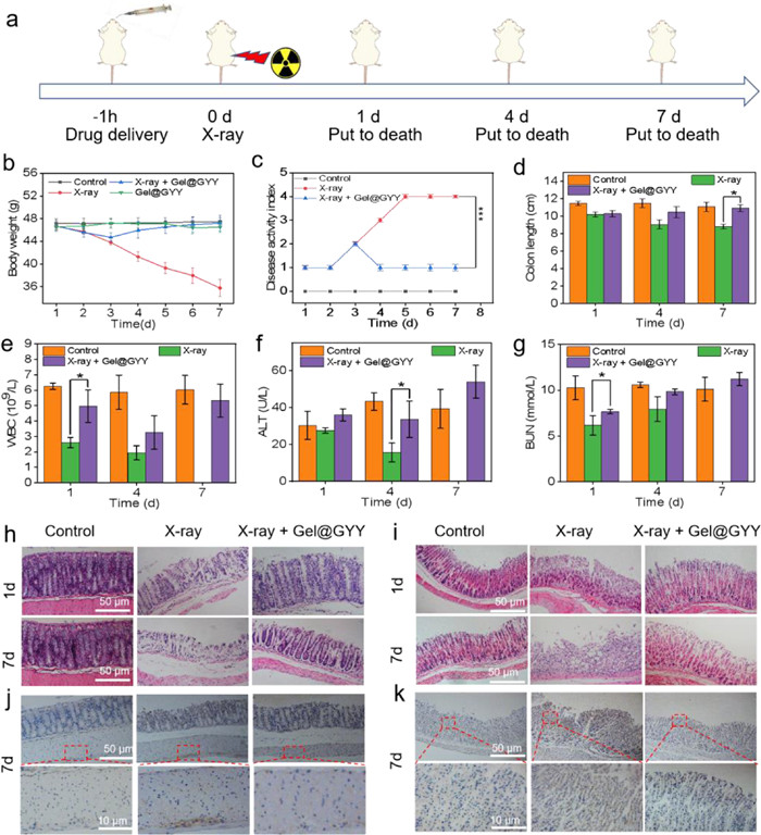 | Fig. 5. Radioprotective effects in a mouse model. (a) Overall experimental procedure. (b) Changes in body weight of mice during treatment. (c) Changes of disease activity index (DAI) in each group after different treatments. (d) Length of colon tissue isolated from mice on days 1, 4 and 7 after X-ray irradiation. (e) Hematological data of WBC of mice on days 1, 4 and 7 after X-ray irradiation. Blood biochemical data of (f) ALT and (g) BUN of mice on days 1, 4 and 7 after X-ray irradiation. X-ray power: 17 Gy (*P < 0.05). H&E staining images of the (h) colon and (i) stomach at different time points. NF-κB immunohistochemical analysis of (j) colon and (k) stomach on the 7 day after X-ray irradiation. Data represent mean ± standard error of the mean (n = 3). | |