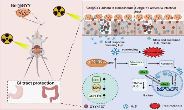 | Scheme 1. Schematic diagram of the protection of GI tract damaged by X-ray. Adhesive Gel@GYY hydrogel as an oral radioprotection agent can responsively release H2S in the gastric acid environment and sustained release H2S in the whole intestinal tract, especially in the colon to effectively scavenge free radicals, retain in the GI tract for sufficient time, suppress inflammatory factors, recover SOD and GSH-Px activity, decrease lipid peroxidation, consequently alleviating the radioactive gastroenteritis. | |