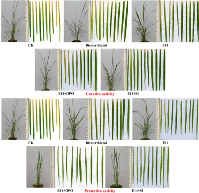 | Fig. 1. Curative and protective activities of compound E14 against rice bacterial blight under greenhouse conditions at 200 µg/mL. 0.1% auxiliaries including organic sicilon (SI) and orange peel essential oil (OPO) were used to regulate the surface wettability of E14 toward rice leaves. The same volume of DMSO was used as a control check (CK). The agrochemical bismerthiazol was employed as the positive control. | |