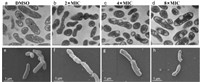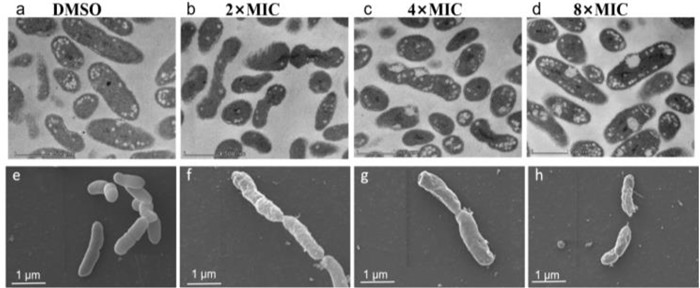 | Fig. 2. TEM (a-d) and SEM (e-h) images of Xoo treated with different amounts of the compound with E14. The scale bar of TEM and SEM image is 500 nm and 1 µm, respectively. | |