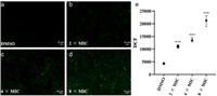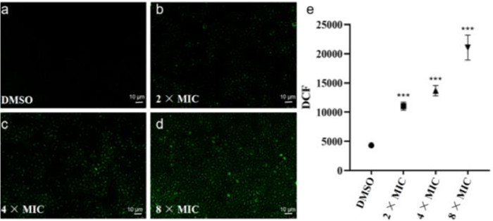 | Fig. 3. Accumulation of ROS in Xoo was monitored by fluorescence microscope after treatment with title compound E14 of DMSO (a), 2× MIC (b), 4× MIC (c) and 8× MIC (d). Scale bar: 10 µm. (e) ROS was detected by flow cytometry. DMSO is the negative control. All experiments were repeated at least three repeats. Asterisks indicate statistically significant differences. ***P < 0.001 vs. DMSO group. | |