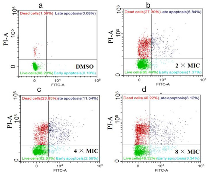 | Fig. 4. Apoptosis assays stained with Annexin V-fluorescein isothiocyanate (FITC) and propidium iodide (PI) using flow cytometry after treatment with compound E14 of DMSO (a), 2× MIC (b), 4× MIC (c) and 8× MIC (d). | |