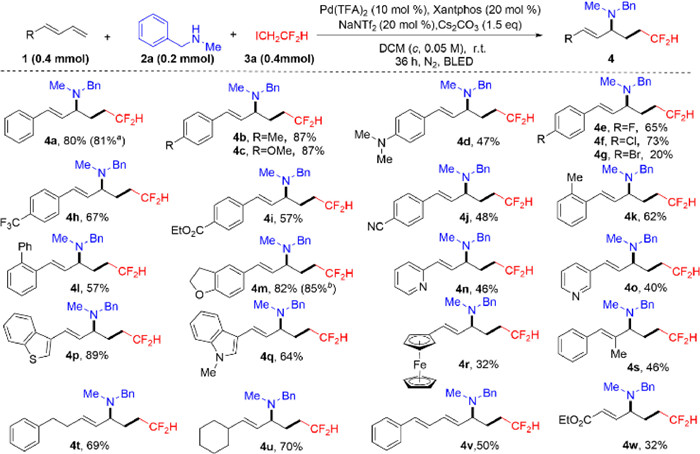 First, we synthesized γ-difluromethylated allylic amines product 4a–4w by varying the different 1,3-dienes 1 with the best yield of 20%–87%. As show in Scheme 1, the desired product 4a–4w could be isolated in the following condition: dichloromethane (DCM) (c = 0.05 mol/L) as the solvent, Pd(TFA)2 (10 mol%) as the catalyst, Xantphos (20 mol%) as the ligand, NaNTf2 (20 mol%) as the additive, and Cs2CO3 (1.5 equiv.) as the base, under the blue light for 36 h. Compounds 4a–4w were subjected to primary screening for bactericidal activity by the inhibition circle method, and those with inhibitory effect were selected for further determination of their minimum inhibitory concentration (MIC). Unfortunately, none of the compounds exhibited inhibitory activity against Xoo (MIC > 400 µmol/L).