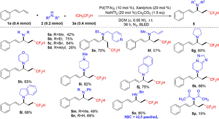 Then, we replaced different amines 2 to further investigate their inhibitory activity. It can be seen in Scheme 2 that various amines can be reacted smoothly and the corresponding target products γ-difluoromethylated allylamine (5a–5p) were obtained in moderate to excellent yields. Among them, compound 5o showed good inhibitory activity against Xoo (MIC = 62.5 µmol/mL).