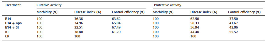Table 2 Protective and curative effects of title compound E14 on the BLB of rice. |
