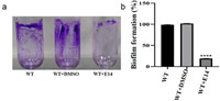 | Fig. 5. Biofilm formation assay with the candidate compound E14 treatment. DMSO is the negative control. Asterisks indicate statistically significant differences. ****P < 0.0001 vs. wild type strain PXO99A (WT) group. | |