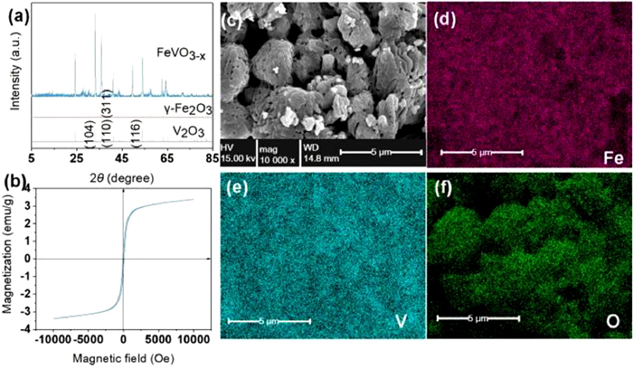 | Fig. 1. (a) XRD spectrum of FeVO3-x. (b) The magnetic hysteresis loop of FeVO3-x. (c) SEM image and (d-f) the corresponding element mappings of FeVO3-x. | |