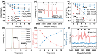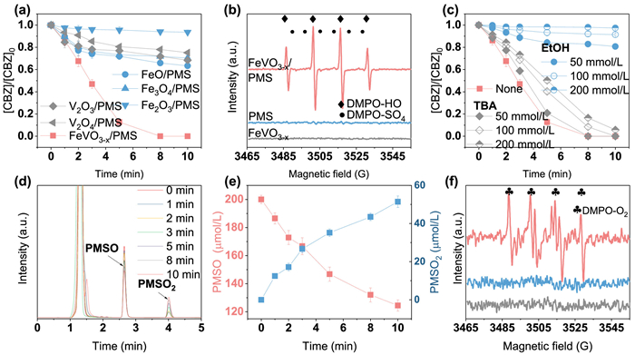 | Fig. 2. (a) CBZ degradation in different systems. (b) DMPO-HO and DMPO-SO4 adducts in the FeVO3-x/PMS system. (c) Quenching effects of TBA and EtOH on CBZ degradation. (d) HPLC chromatograms of PMSO and PMSO2 in the FeVO3-x/PMS system. (e) PMSO degradation and PMSO2 generation in the FeVO3-x/PMS system. (f) DMPO-O2 adducts in the FeVO3-x/PMS system. Experiment condition: [FeVO3-x]0 = 100 mg/L, [PMS]0 = 0.2 mmol/L, [CBZ]0 = 2.5 mg/L, pHini = 6.3, [PMSO]0 = 200 µmol/L, [DMPO]0 = 50 mmol/L. | |