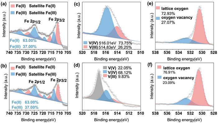 | Fig. 3. XPS spectra of fresh and used FeVO3-x: Fe 2p core level in the (a) fresh and (b) used FeVO3-x, V 2p core level in the (c) fresh and (d) used FeVO3-x, O 1s core level in the (e) fresh and (f) used FeVO3-x. | |