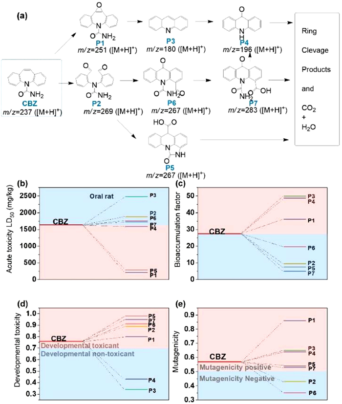 Furthermore, we also evaluated the developmental toxicity, acute toxicity, bioaccumulation factor and mutagenicity of original CBZ and its intermediates through the Toxicity Estimation Software Tool. Fig. 6b shows the oral rat LD50 of P1 and P5 are 213.16 and 287.73 mg/kg, respectively, which are much lower than that of CBZ (1636.63 mg/kg), implying the acute toxicities of P1 and P5 are quite more toxic than original CBZ. However, the acute toxicities of most types of intermediates are much lower than CBZ. Since the potential hazards of these intermediates are negative correlation with bioaccumulation factor, and Fig. 6c shows the bioaccumulation factors of P2, P5, P6, P7 (9.56, 7.41, 19.70, and 4.98, respectively) are much lower than that of CBZ (27.38), four intermediates have quite lower risks than CBZ. However, the results of developmental toxicity (Fig. 6d) and mutagenicity (Fig. 6e) suggest that five developmental toxicants (P1, P2, P5, P6 and P7) and five mutagenicity negative intermediates (P1, P3, P4, P5 and P7) are generated after treatment process.