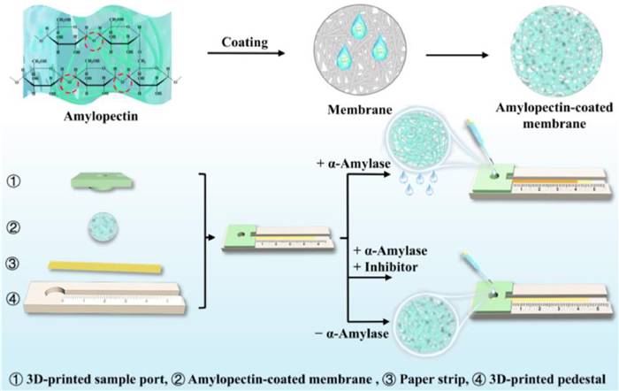 When the target is introduced into the sample zone, it hydrolyzes the amylopectin and changes the mesoporous membrane's permeability. The solution passes through the mesoporous membrane from the sample zone and streams along the paper strip. The amount of AMY is positively correlated to the aqueous flow distance. The detection of AMY is successfully achieved in human serum. Furthermore, the screening of the AMY inhibitor is also accomplished, showing the potential of the method in screening hypoglycemic drugs. This biosensor is disposable, inexpensive, and user-friendly, allowing reagent-free and single-step detection with considerable convenience, high portability, and more practicality. Therefore, developing commercial POCT devices with various potential applications is very promising.