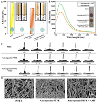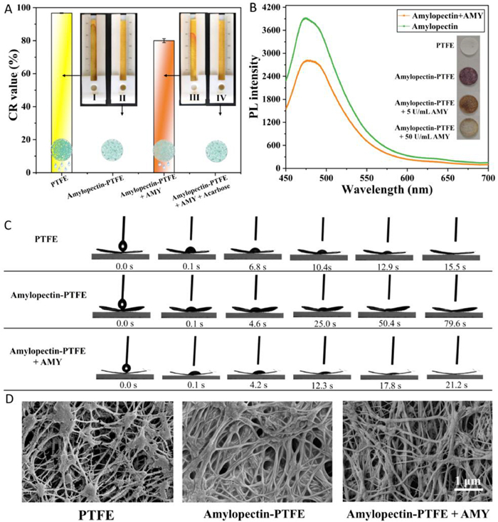 | Fig. 2. The feasibility of the development of the distance-based AMY biosensor. (A) CR values and seepage flow images after 40 µL aqueous solutions were added into the sample zone comprising (Ⅰ) uncoated PTFE membrane and (Ⅱ) 5% amylopectin-coated PTFE membrane; and amylopectin-coated PTFE membrane in 40 µL (Ⅲ) 10 U/mL AMY, and (Ⅳ) mixture of 10 mg/mL acarbose and 10 U/mL AMY, respectively. (B) Fluorescence intensities of thioflavin T at amylopectin solutions before and after enzymatic hydrolysis of AMY. The inset shows the iodine color reactions on PTFE membranes. (C) Wetting processes of 4 µL water droplets on the PTFE membrane, amylopectin-coated PTFE membrane, and amylopectin-coated PTFE membrane in the presence of AMY, respectively. (D) SEM images of PTFE membrane and amylopectin-coated PTFE membrane before and after the addition of AMY. The scale bar is 1 µm. | |