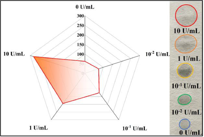To further verify that the AMY-catalyzed hydrolysis of amylopectin coating, fluorescence, paper diffusion, iodine colorimetry, water contact angle (WCA), and scanning electron microscopy (SEM) studies were conducted. A viscosity-sensitive fluorescent probe, thioflavin T, was added to the amylopectin solution, which shows high fluorescence. However, the fluorescence intensity of the solution decreased after adding AMY to the solution, suggesting the decrease of viscosity due to amylopectin degradation in the presence of AMY (Fig. 2B). Iodine colorimetry was employed to examine the AMY-catalyzed cleavage of amylopectin on the PTFE membranes. Distinctive color changes were unambiguously observed due to the iodine-amylopectin reaction on the PTFE membrane (Fig. 2B inset). The WCA tests show that the wetting speed of the water droplet (4 µL) significantly decreased on amylopectin-coated PTFE membrane compared to bare PTFE membrane. Subsequently, the wetting speed of the water droplet was enhanced after exposure to AMY (Fig. 2C). Also, the SEM images show that amylopectin attached to the fiber and diminished the pore sizes in the PTFE membrane and the porosity increased after AMY hydrolysis (Fig. 2D). In addition, the paper diffusion method was also carried out. 5 µL amylopectin (5 wt%) solutions were hydrolyzed through different concentrations of AMY and dropped onto the filter paper, respectively. Due to the viscosity variance of the AMY-catalyzed solutions, the diffusion area raised with increasing concentrations of AMY (Fig. 3). The above experiments validated the feasibility of the method to detect AMY by coating amylopectin on the PTFE membrane.