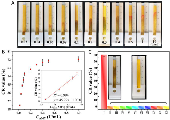 | Fig. 4. The sensitivity and selectivity of the distance-based AMY biosensor. (A) Seepage flow distances at different AMY concentrations (0–10 U/mL). (B) Plot of CR values against AMY concentrations and a linear plot of CR values as a logarithmic function of AMY concentrations. (C) CR values and images of seepage on paper in (Ⅰ) 10 U/mL AMY, (Ⅱ) heparin sodium, (Ⅲ) uric acid, (Ⅳ) KCl, (Ⅴ) MgSO4, (Ⅵ) lysozyme, (Ⅶ) urease, (Ⅷ) trypsin, (Ⅸ) lipase, (Ⅹ) pepsin, and (Ⅺ) hyaluronidase, respectively. The concentrations of all enzymes were 10 U/mL, and the concentrations of all small molecules and salts were 0.1 mg/mL. | |