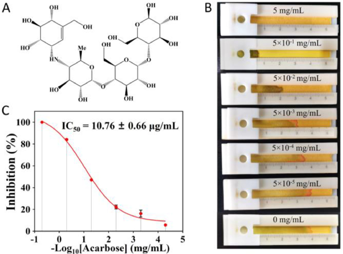 The distance-based biosensor was also used to study the inhibitory effect of acarbose on AMY. The inhibitory effects of acarbose (Fig. 5A) at different concentrations on AMY were measured. Fig. 5B demonstrates that the increasing acarbose concentration inhibits the AMY activity, reducing the seepage flow distance on the paper strip. And the half maximal inhibitory concentration (IC50) was determined and calculated to be 10.76 ± 0.66 µg/mL from the sigmoid curve (Fig. 5C). Therefore, this method works well for studying the inhibitory effect of acarbose on AMY.