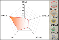 | Fig. 3. Diffusion areas of 5 wt% amylopectins hydrolyzed by different concentrations of AMY on filter paper. The inset image shows the photograph of these solutions diffusing on filter paper. The mixtures of 5 wt% amylopectin and different concentrations of AMY were individually prepared, incubated at 37 ℃ for 20 min, and then added onto the filter paper. The volume of each mixture is 5 µL. | |