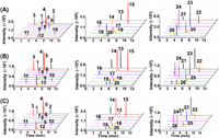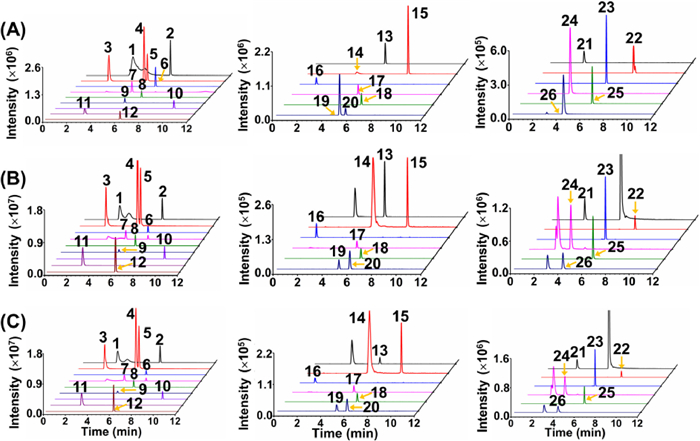 | Fig. 2. Extracted-ion chromatograms of detected 26 RNA modifications from rat cortex. (A) Nucleoside standards. (B) Nucleosides detected in small RNA of rat cortex from control group. (C) Nucleosides detected in small RNA of rat cortex from alcohol exposure group. The peaks were labeled with numbers. 1, m1A; 2, m6A; 3, m7G; 4, m1G; 5, m2G; 6, Am; 7, m1I; 8, m2,2,7G; 9, Gm; 10, i6A; 11, Cm; 12, m2,2G; 13, ac4C; 14, m1,6A; 15, m6,6A; 16, Y; 17, mcm5U; 18, f5Cm; 19, m5Cm; 20, m3Cm; 21, I; 22, m6Am; 23, t6A; 24, m5U; 25, m5Um; 26, Um. | |