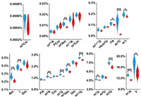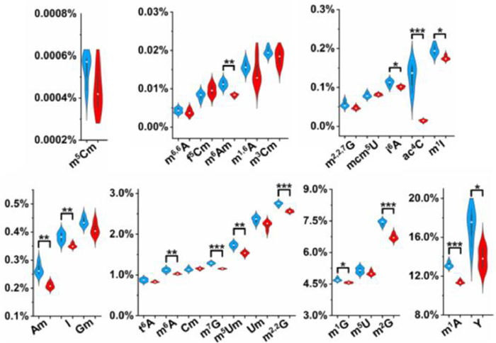 | Fig. 4. The measured levels of small RNA modifications in cortex from control and alcohol exposure groups. Shown in blue and red represent the modifications from control and alcohol exposure groups, respectively. The y-axis represents the levels of RNA modifications over their corresponding normal nucleosides. *, P < 0.05; **, P < 0.01; ***, P < 0.001. | |