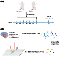| Fig. 1. Schematic illustration for the alcohol exposure and mass spectrometry profiling of RNA modifications. (A) The schematic diagram of the timeline for the alcohol exposure and tissue collection from rats. (B) Workflow of profiling of small RNA modifications in four rat brain tissues of cortex, subcortex, hippocampus, and cerebellum by LC-ESI-MS/MS analysis. PND: postnatal day. | |