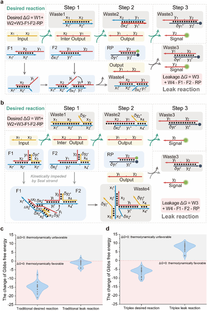 | Fig. 1. Comparison of traditional and triplex translator systems. The traditional translator fuel complex (TOP strand: F1-x2y1, F2-y1y2; BOT strand: F1-x1*x2*x3*, F2-δx2*y1*x4*) and the triplex fuel complex (SEAL strand: F1-δy1*x3, F2-δy2*x4; TOP and BOT strands are as same as traditional) are shown. The symbol * denotes the complementary domain of the original domain, and the symbol δ denotes a subsection of the original domain. (a, b) The intended pathway of the desired and leak reaction are illustrated for both systems. (c, d) The change of Gibbs free energy ΔG in the traditional and triplex translator systems. ΔGdesired in both two systems are less than 0. Most of the ΔGleak in the traditional system are less than 0, and all of the ΔGleak in the triplex system are greater than 0. The details of calculation process and sequence information are included in the Tables S3–S6 in Supporting information. | |