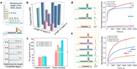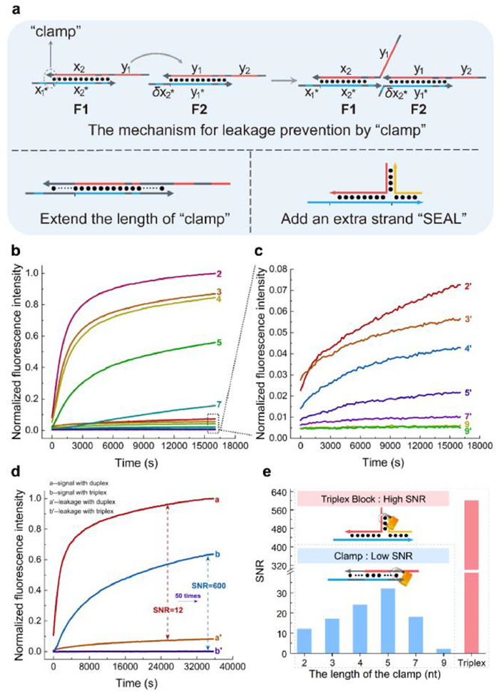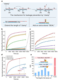 | Fig. 2. Comparison of the effect of "clamp" and the triplex structure. (a) Mechanism and improvement directions of traditional "clamp" for leakage prevention. (b, c) Kinetics of the traditional translator system with clamp domains of different lengths with and without input strands. n and n' referred to the desired and leak reactions respectively when the clamp length was n. (d) Long-time running of the triplex translator system. In 10-hour timeframe, the SNR in the triplex translator system reaches 600, 50 times that of the traditional structure. (e) The SNR of the traditional translator system with clamp domains of different lengths and the triplex translator system. The SNR of the translator with the extended clamp domain can be up to almost 2 times that of the translator with the original clamp domain, while the SNR of the triplex domain is 50 times better. The inputs are added no more than 3 min before measurement at 25 ℃. | |