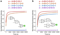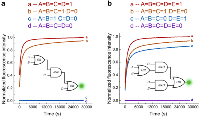 | Fig. 5. (a) Abstraction and kinetics experiments of three-layer cascades OR–AND–OR. (b) Abstraction and kinetics experiments of a moderate-scale circuit of four gates. The experiment was performed at 25 ℃. | |