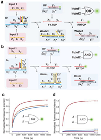 | Fig. 4. (a) Implementation of a one-input triplex circuit that computes OR. (b) Implementation of a two-input triplex circuit that computes AND. (c, d) Kinetics of the triplex circuits that computes AND/OR with and without input strands. The leakage signal was not measurable in the absence of input. The experiment was performed at 25 ℃. | |