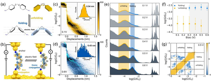 In conclusion, we demonstrated the electric field-controlled molecular folding and unfolding using the STM-BJ technique. We found that molecular folding/unfolding controlled by the strong electric field leads to the switch between distinct 'unfolding' and 'folding' conformations in the single-molecule junctions. The electric field-induced homoconjugated conformation provides a new through-space pathway and leads to a ~1400% enhancement of conductance. The DFT results indicate that the homoconjugated conformation is formed via a strong electric field-induced charge injection that the applied electric field significantly reduced the energy barrier, and the transmission probabilities are consistent with experimental results. This work provides a new strategy for the control of molecular folding for the future design and fabrication of molecular machine and responsive molecular materials.