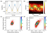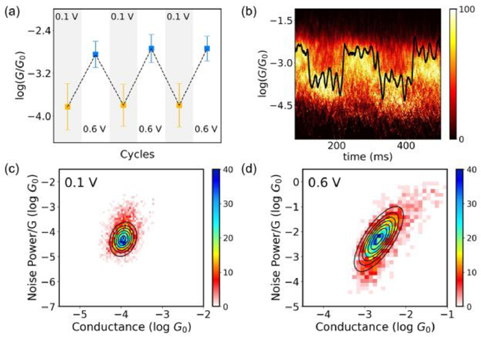 | Fig. 2. Switching performance of single-molecule junctions. The detailed measurement and data processing are described in the methods section in Supporting information. (a) Plots of the dominant conductance with three subsequent switching cycles. The errors are the standard deviation of the Gaussian fitting from corresponding one-dimensional conductance histograms. (b) Two-dimensional conductance histograms for the in-situ and reversible switching performance. The black curve is a typical individual switching trace. Two-dimensional histograms of normalized flicker noise power versus the average conductance of DDM with different bias voltages, (c) 'unfolding' state, (d) 'folding' state. The noise power scales are determined to be G1.4 for the 'unfolding' state and G2.0 for the 'folding' state. | |