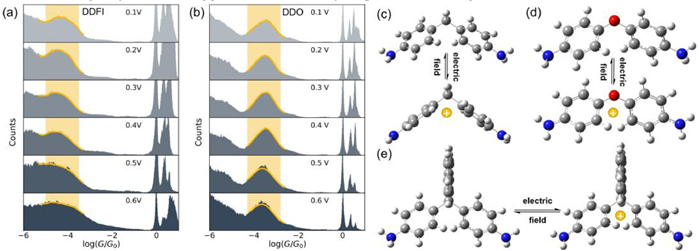 | Fig. 3. One-dimensional conductance histograms under different bias voltages. (a) DDFI, (b) DDO. The conformations of the ground states and the charge injected states: (c) DDM, (d) DDO, (e) DDFI. | |