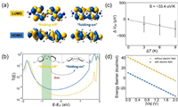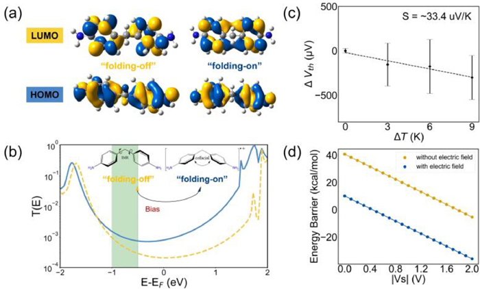 | Fig. 4. Theoretical results for the charge transport. (a) Frontier molecular orbitals of two conformations, and the isovalue is 0.02. (b) The transmission curves at zero bias voltage. The green ribbon regime shows the possible range of the Fermi energy. The homoconjugated conformation is injected with a single + charge, and the nonconjugated state is in the ground state conformation. (c) The Seebeck coefficients obtained from the thermoelectric voltage as a function of ΔT = +0 K, +3 K, +6 K and +9 K. The dashed line is the linear fitting lines. The error bars are based on the standard deviation in the Gaussian fitting of thermoelectric voltages. (d) The calculated energy barrier. Blue and yellow curves represent the cases with and without the oriented external electric fields (OEEFs) along with two nitrogen atoms (F = 0.005 a.u.), respectively. | |