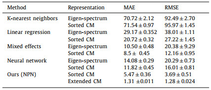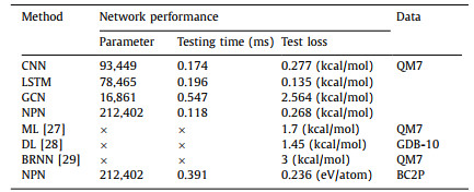 By training on a large set of different molecules in QM7, we use MAE and root mean square error (RMSE) as evaluation indicators to evaluate the prediction performance of various algorithms under different molecule presentation methods. The comparison results between our method and other methods [22] are shown in Table 1. Our results indicate that the proposed method exhibits a lower prediction error, indicating excellent prediction performance. Based on this, we trained and tested different DL models we designed on the QM7 dataset [26], and obtained some information that reflects the performance of the models, such as model parameters, testing time, and testing errors. Experiments on real-world datasets [26] show that NPN can achieve state-of-the-art performance on regression tasks. The performance of different methods are compared in Table 2.