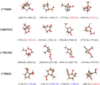 | Fig. 3. Visualization of different conformations of four molecules and comparison of their AE prediction results. Corresponding predicted AEs by our model are shown in parentheses, all AEs are in kcal/mol. Our model has a prediction error of about 0.2–3 kcal/mol for AE. The data marked in blue indicates an error between 5 and 10 kcal/mol, while the data marked in red indicates an error over 10 kcal/mol. | |