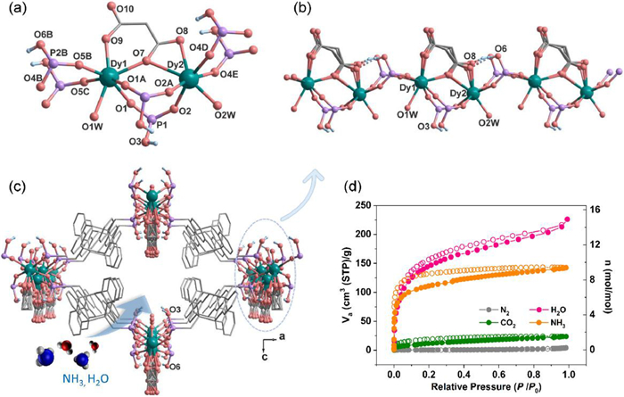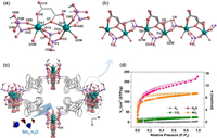 | Fig. 1. (a) Building unit of MDAF-6. Part of the disordered malonate and the organic group of amp2H22− ligand are omitted for clarity. (b) The infinite chain in MDAF-6 running along the b-axis. (c) The framework structure of MDAF-6 viewed along the b-axis. All H atoms except for those attached to phosphonate oxygen atoms are omitted for clarity. (d) The adsorption (filled) and desorption (open) isotherms for solvent-free MDAF-6: N2 (77 K), CO2 (298 K), NH3 (298 K) and water vapor (298 K). | |