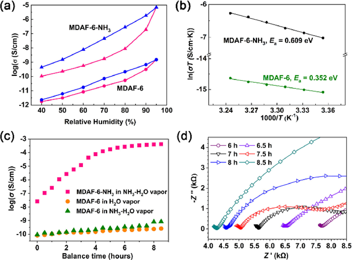 | Fig. 2. (a) Proton conductivities of MDAF-6 and MDAF-6-NH3 from 40% to 95% RH at 298 K (pink for increasing RH and blue for decreasing RH). (b) Arrhenius plot of the temperature dependence at 95% RH for MDAF-6 (green) and MDAF-6-NH3 (black). (c) Proton conductivities of MDAF-6-NH3 in ammonia vapor, MDAF-6 in water vapor and MDAF-6 in ammonia vapor. (d) Nyquist plots of MDAF-6-NH3 in ammonia vapor for 6–8.5 h. | |