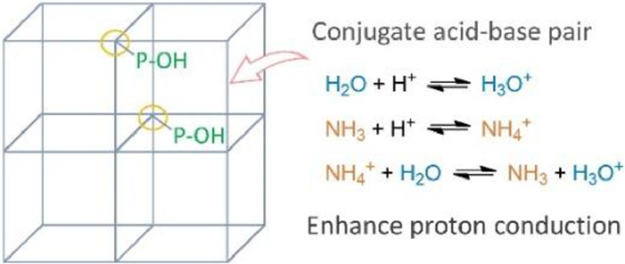 The above results showed that the water-mediated proton productivity of MDAF-6 was significantly enhanced after the incorporation of NH4+. In this case, there exist two acid-base pairs, e.g., H3O+-H2O and NH4+-H2O, which participate in the proton conduction pathway. We postulate that the presence of conjugate acid-base pair of NH4+-NH3 would facilitate the proton mobility.