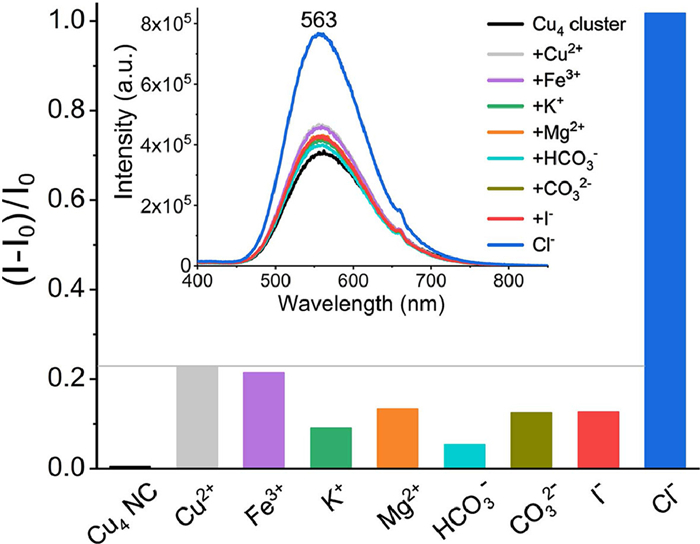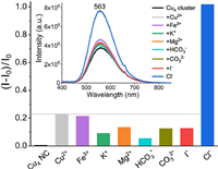 Considering the moderate luminescence and relatively stable emission of the Cu4(dppy)4Cl2 NCs, we have evaluated its chemo sensing for ions detection. As shown in Fig. 5, a few common ions including Cu2+, Fe3+, K+, Mg2+, HCO3−, CO32−, I−, Cl− (1.0 mmol/L for all) have been tested. It is found that the presence of Cl− ions results in apparent increase of the emission intensity, which contrasts with all the other tested cationic and anionic ions. The chemo sensing toward Cl− ions is likely associated with the distinct coordination interactions between Cl− and the Cu4(dppy)4Cl2 NCs.