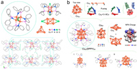 | Fig. 1. Single-crystal structures of (a) Cu4(dppy)4Cl2, with a CH2Cl2 and a Cl3 involved and (b) Cu21(dppy)10. The insets include the natural population analysis (NPA) of charge distribution of Cu21 nanocluster. Cu in orange, P pink, N blue, Cl green, and C grey. For clarity, H atoms are omitted. Capped sticks and ball-stick styles (instead of thermal ellipsoids) are displayed for the two kinds of Cu clusters. | |