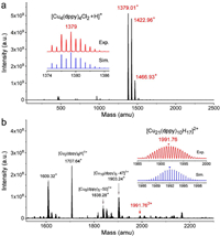 | Fig. 2. ESI-MS of (a) Cu4(dppy)4Cl2 and (b) Cu21(dppy)10 NCs in the positive ion mode, respectively. Insets display the experimental spectrum in a comparison with the simulated isotopic patterns. | |