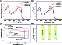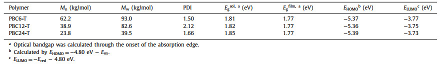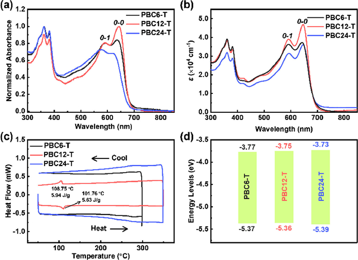 | Fig. 1. The optical absorption spectra of PBC6-T, PBC12-T and PBC24-T in (a) chloroform solution and (b) thin films (with absorption coefficients). (c) The DSC heating and cooling traces (second cycle) and (d) the energy levels of the polymer PBC6-T, PBC12-T and PBC24-T. | |