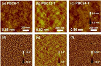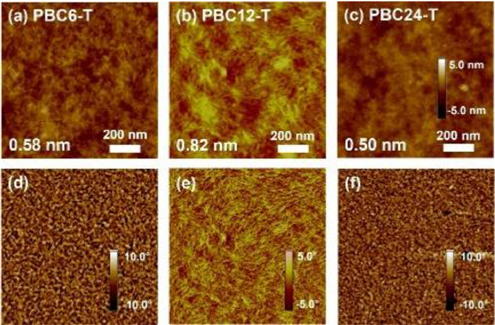 The thin film morphology of the polymers was characterized by atomic force microscopy (AFM) measurement. As shown in Fig. 3, all these polymers exhibited "fiber-like" microstructures in both the height and phase images. However, the fibers in PBC6-T and PBC24-T films were significantly smaller with low root-mean-square (RMS) roughness of 0.58 nm and 0.50 nm (Figs. 3a and c), respectively. Due to the better crystallinity of PBC12-T, the corresponding films showed larger microfibers in films with a higher RMS value of 0.82 nm as shown in Fig. 3b. The larger "fiber-like" grains and better nano-scale phase separation of PBC12-T facilitate exciton-to-charge conversion and charge carrier transport, enhancing its PCE in SCOSCs [37].