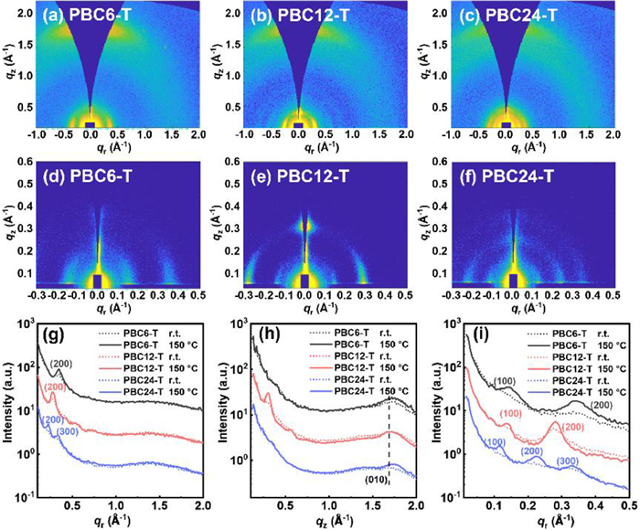 | Fig. 4. (a-c) GIWAXS and (d-f) GIMAXS profiles on the Si substrates of PBC6-T, PBC12-T and PBC24-T thin films. (g) In-plane and (h) out-of-plane plots of the corresponding GIWAXS images. (i) In-plane cutlines of the GIMAXS images. | |