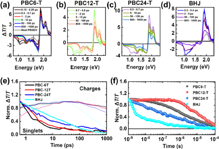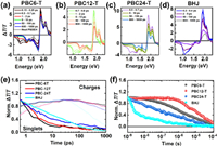 | Fig. 5. The ps-ns TA spectra of (a) PBC6-T, (b) PBC12-T, (c) PBC24-T and (d) BHJ films after exciting at 650 nm. (e) ps-ns TA kinetics of charge-dominated (1.65–1.75 eV) and singlet-dominated (0.9–1 eV) spectral regions. (f) ns-µs TA kinetics of 1.65–1.75 eV band after exciting at 532 nm. | |